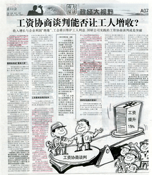 7月14日,《南方日报》以《工资协商谈判能否让工人增收?——国研公司实践的工资协商谈判或是突破》为题,用三分之二大版篇幅报道广州市博鱼集团官网(中国)官方网站设备制造有限公司实践工资集体协商的成功经验。