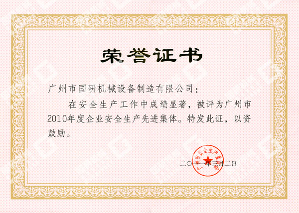 近日,在广州市人民政府召开的安全生产工作总结暨表彰大会上再次传来喜讯,广州市博鱼集团官网(中国)官方网站设备制造有限公司被广州市人民政府授予“广州市2010年度企业安全生产先进集体”荣誉称号。这是我司获得中华全国总工会和国家安全生产监督管理总局授予2009年度全国“安康杯”竞赛优胜企业称号后,被授予的又一殊荣。